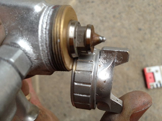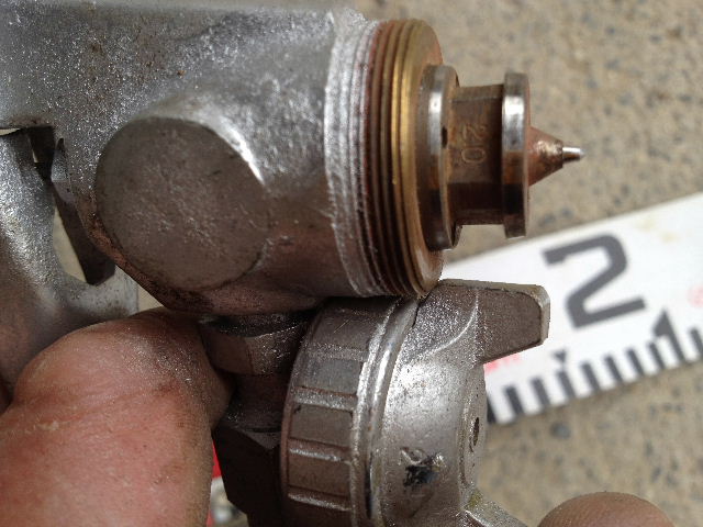スプレーガンはノズル径で使える釉薬の粒子や流動性が変わる。ノズルカバーに印字している番号は何を指すのか私では判らない。