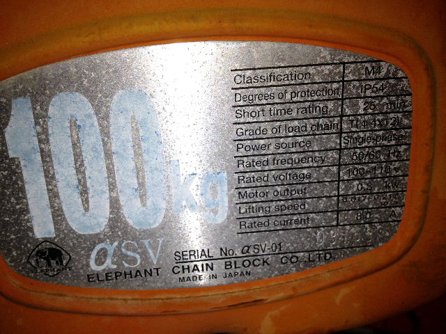 チェーンブロック 100V0.3kw 最大揚力100kg